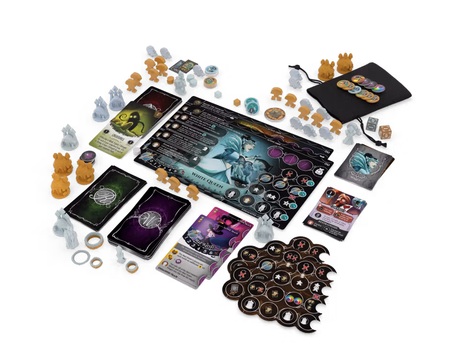 The Caterpillar and White Queen have joined the battle for Wonderland. The White Queen deploys her chess pieces to grant stong openings. The Caterpillar share his Smoke Tokens which can be spent to take new special actions! New modular Forge Boards change the way to see the game.