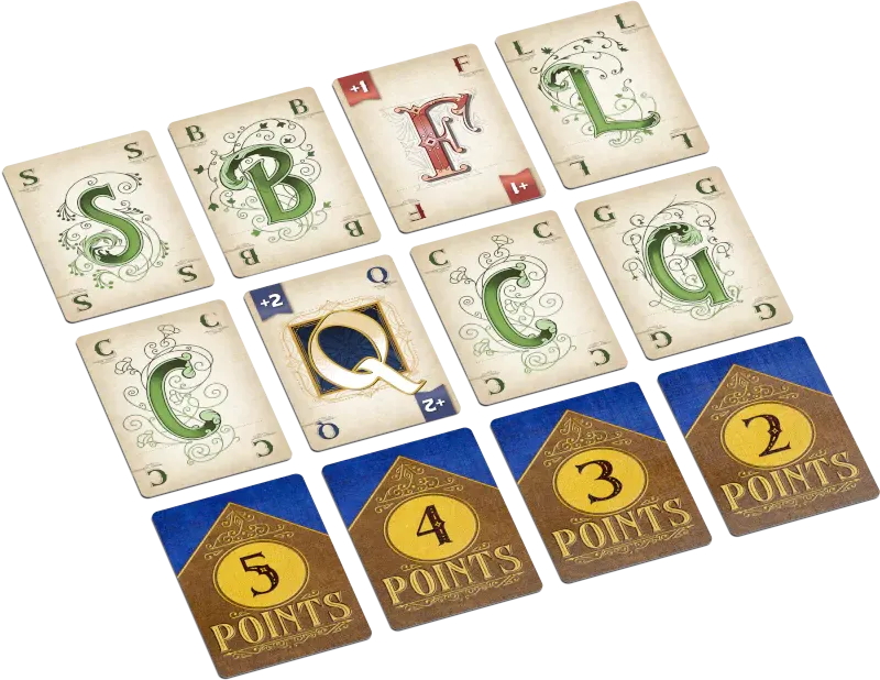 Deal two faceup letters above each point card. These letters will score, but you can use any letters when you play.
